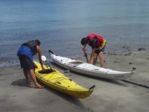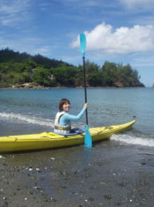 二見湾はおがさわら丸が停泊するところ。 「なーんだ近場か・・」と思うことなかれ ガイドブックには載っていないポイントもたくさんあります。 ビーチからビーチを気軽に転々とできるのも大きな魅力 一人乗りのカヤックに挑戦したい方はこの湾のなかで練習します。 |
