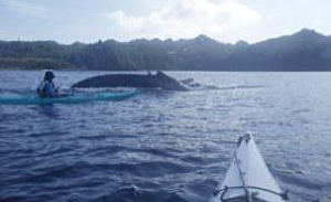 | ザトウクジラが島の周りに集まる2月~4月。シーカヤックでホエールウォッチングも可能です。 静かなカヤックでの探し方のポイントは「聴覚」。クジラのブロー(息継ぎ)に耳をすまし、背後の気配を感じよう。 |